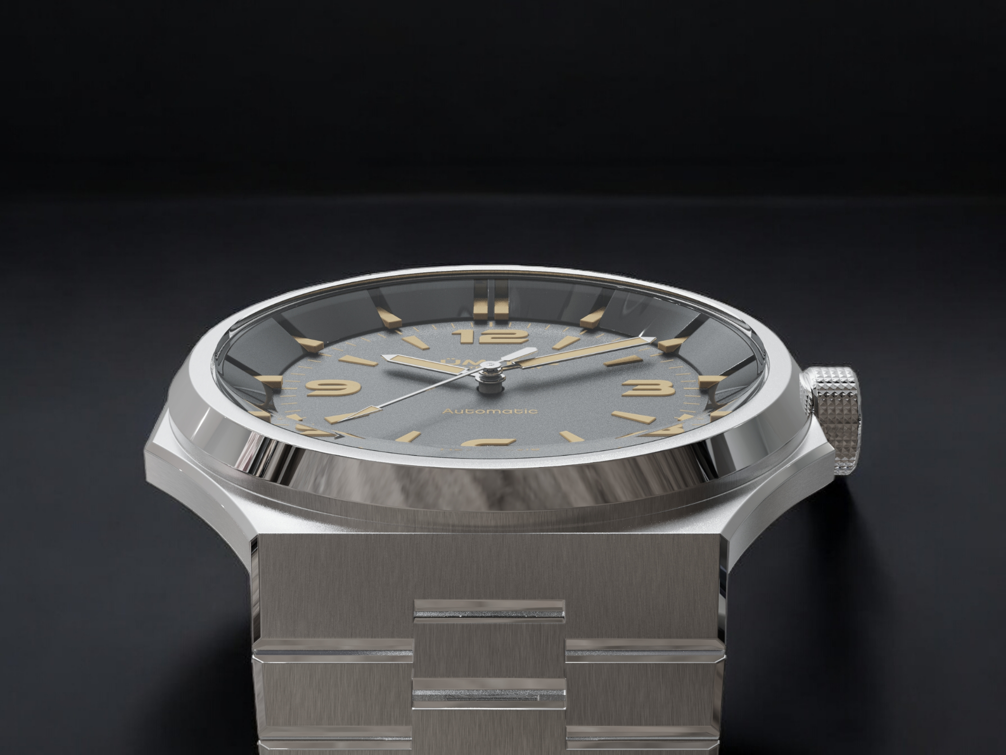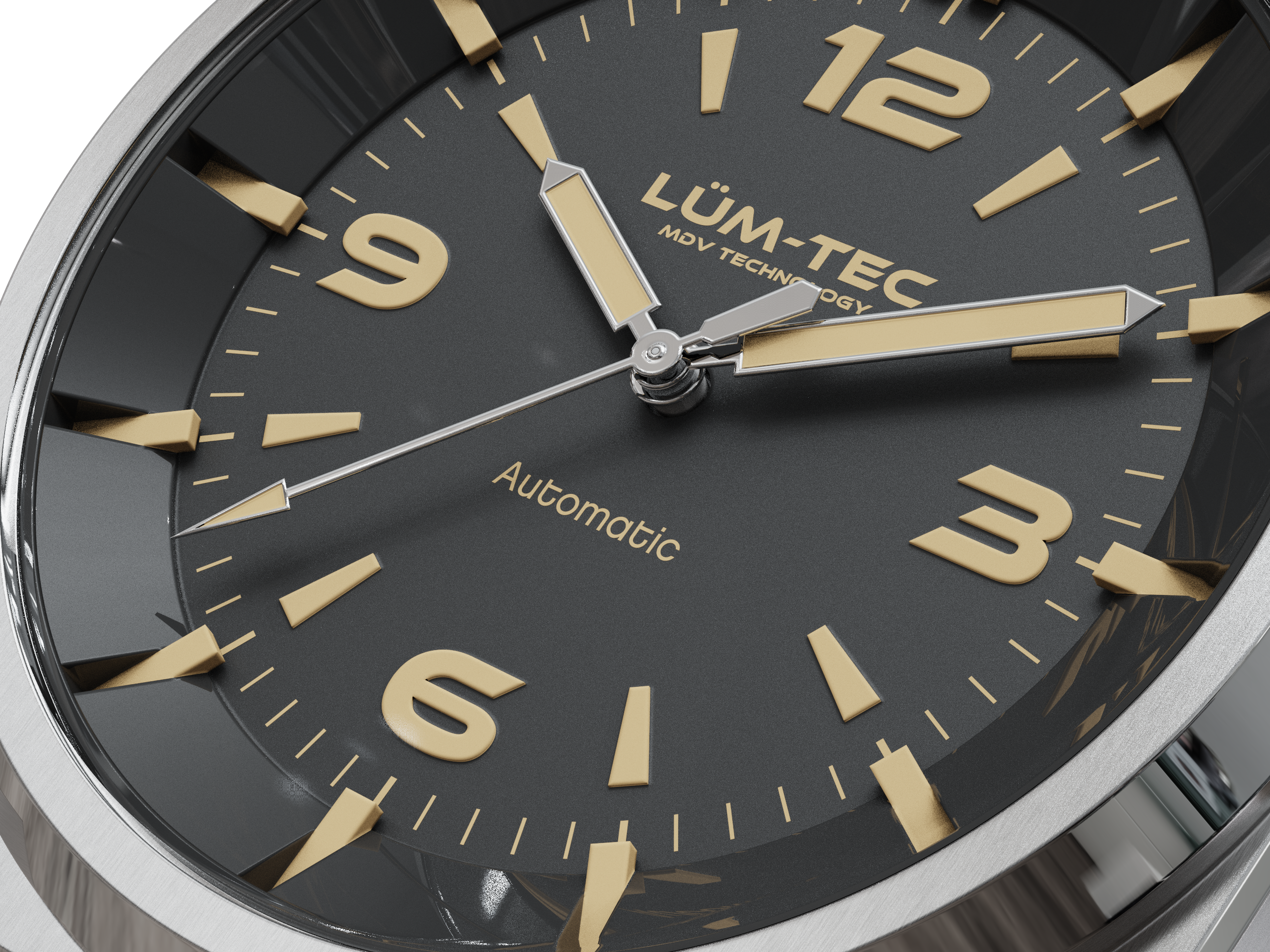 - Bi-layer matte and lacquer charcoal gray 3D dial with extruded luminous index