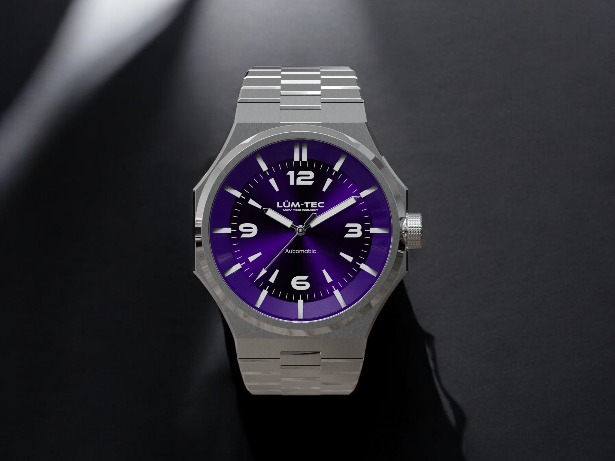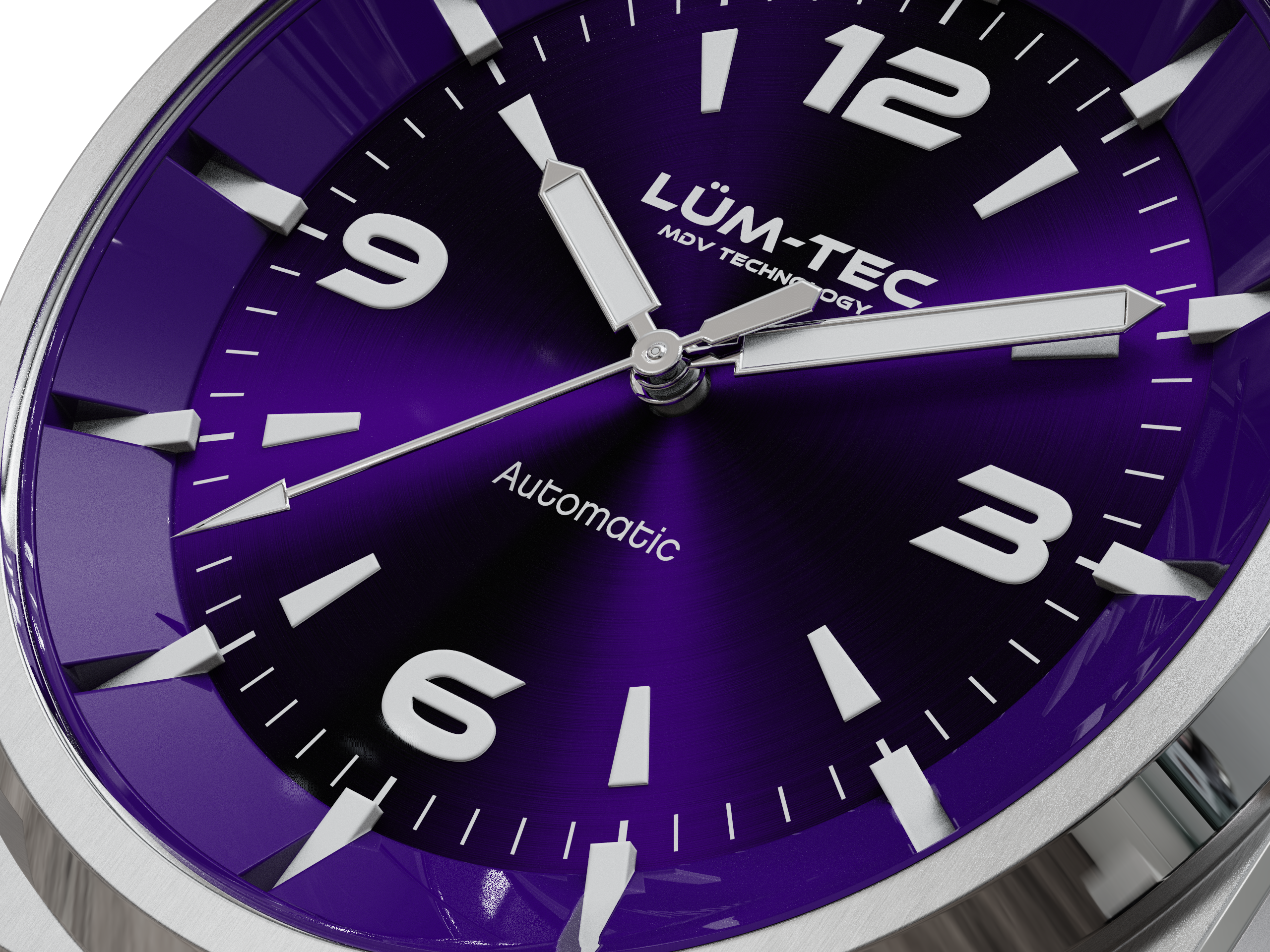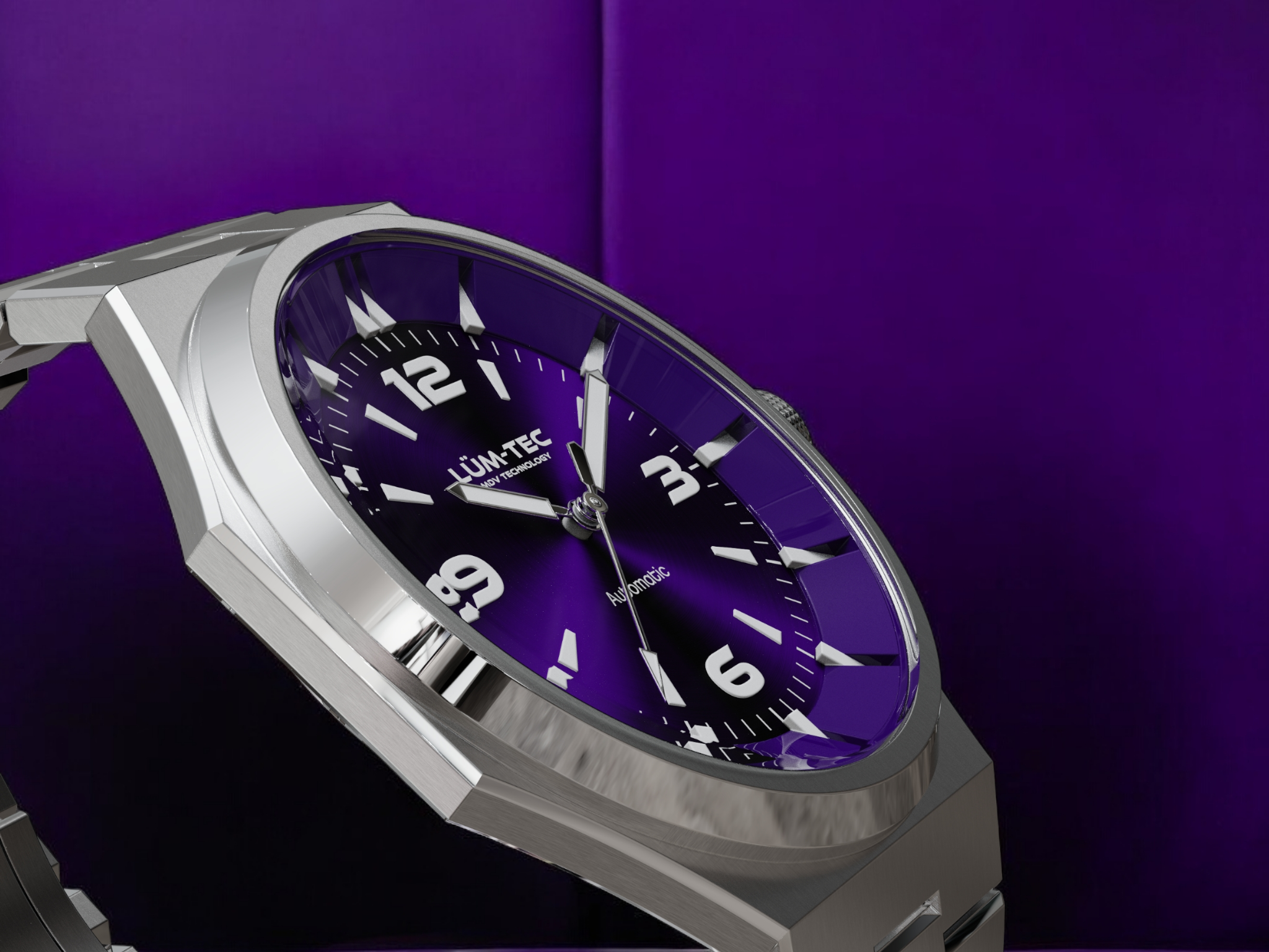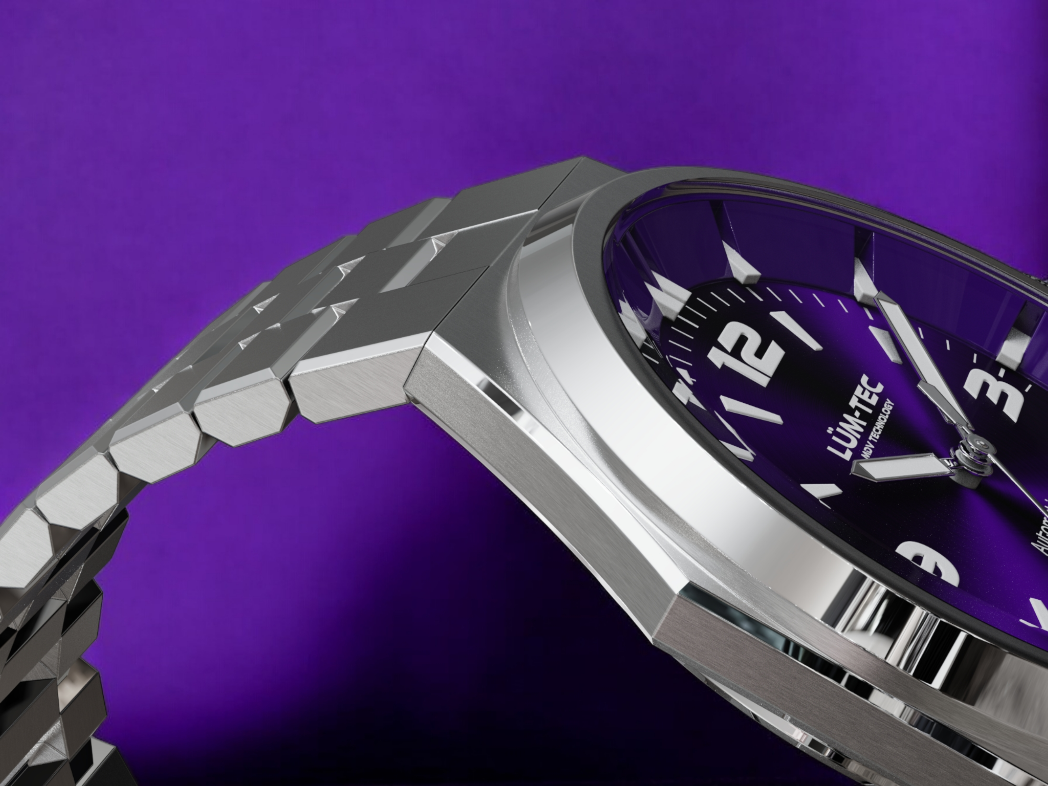 - Bi-layer purple sunburst 3D dial with extruded luminous index