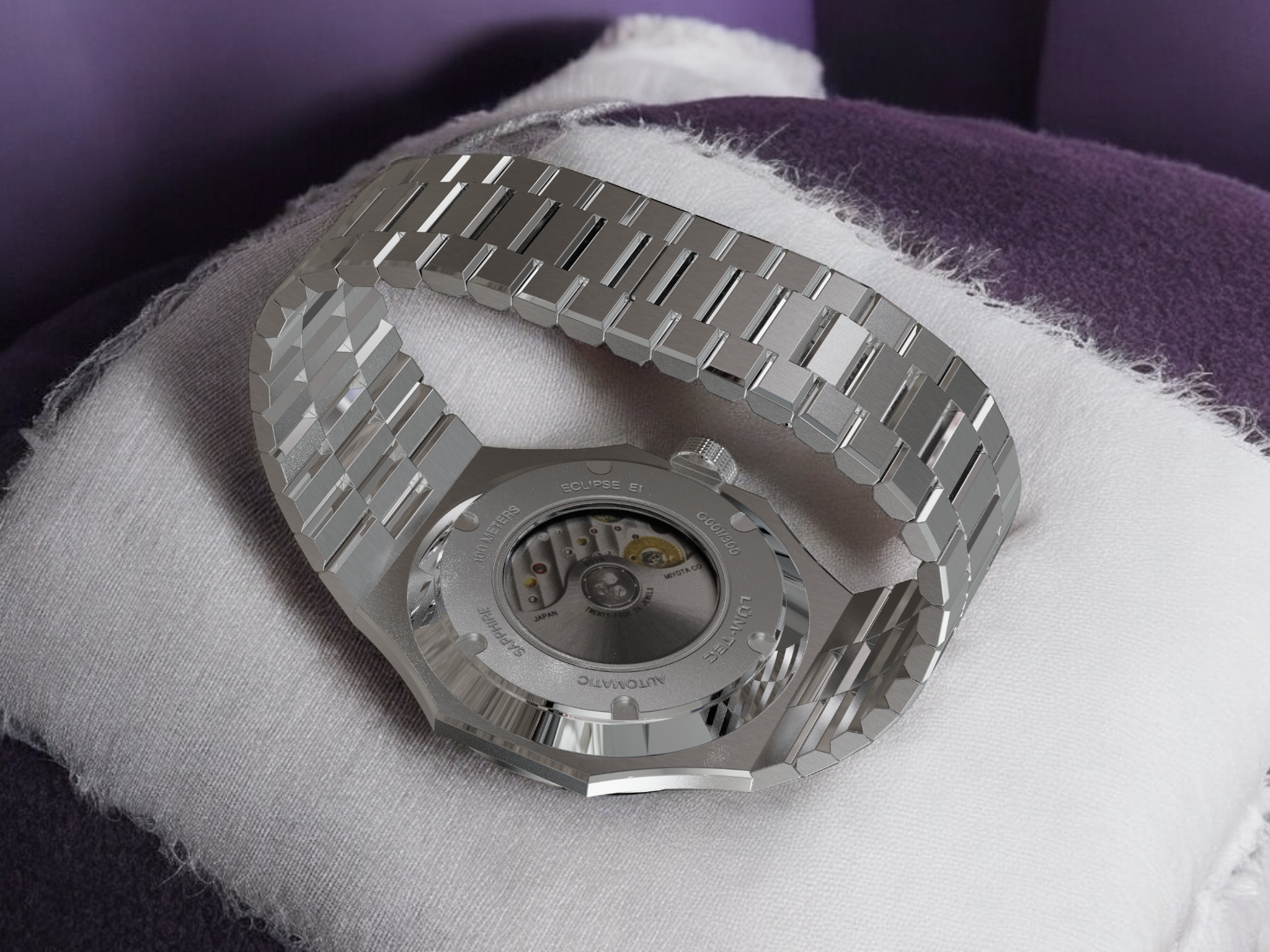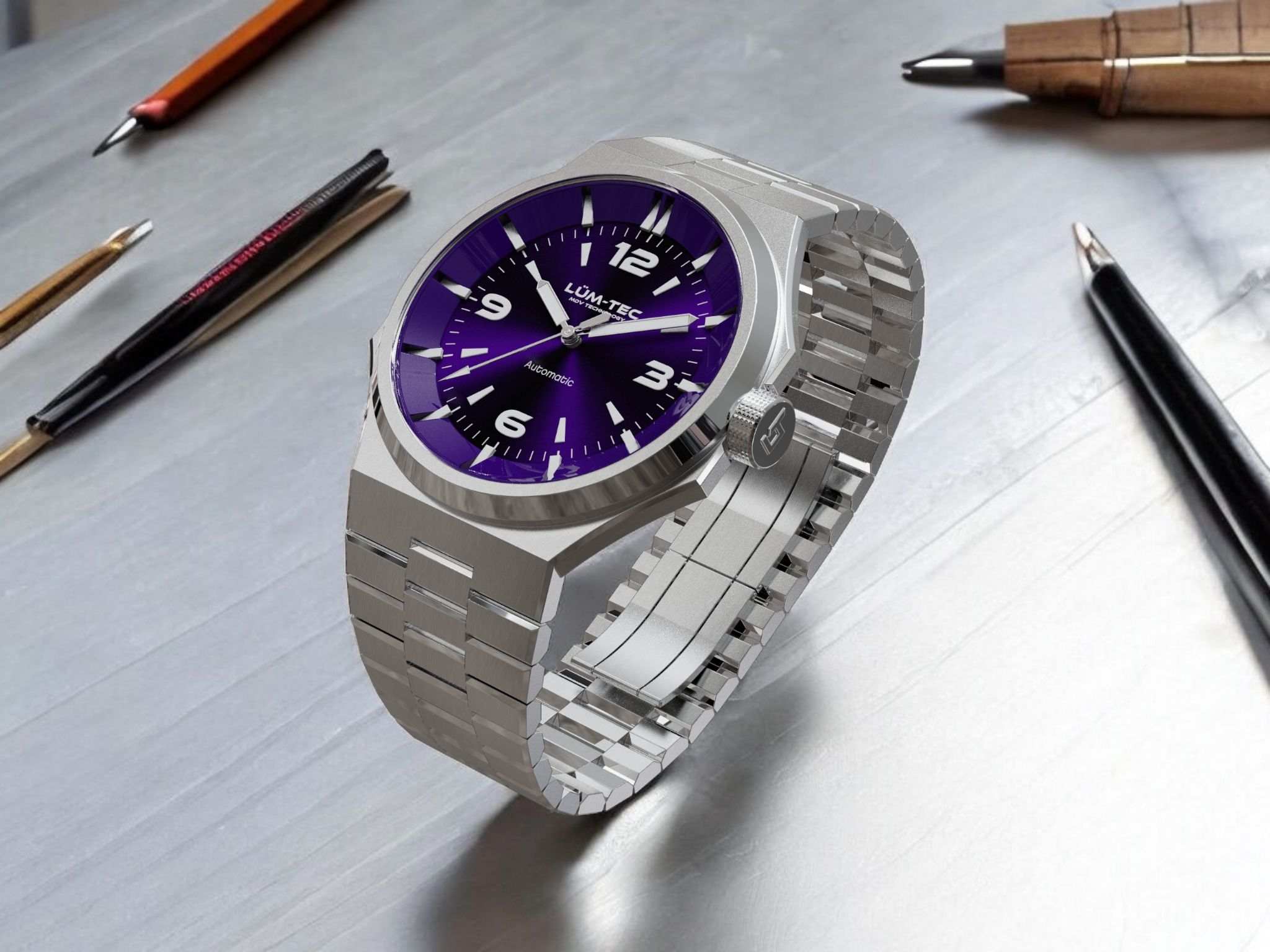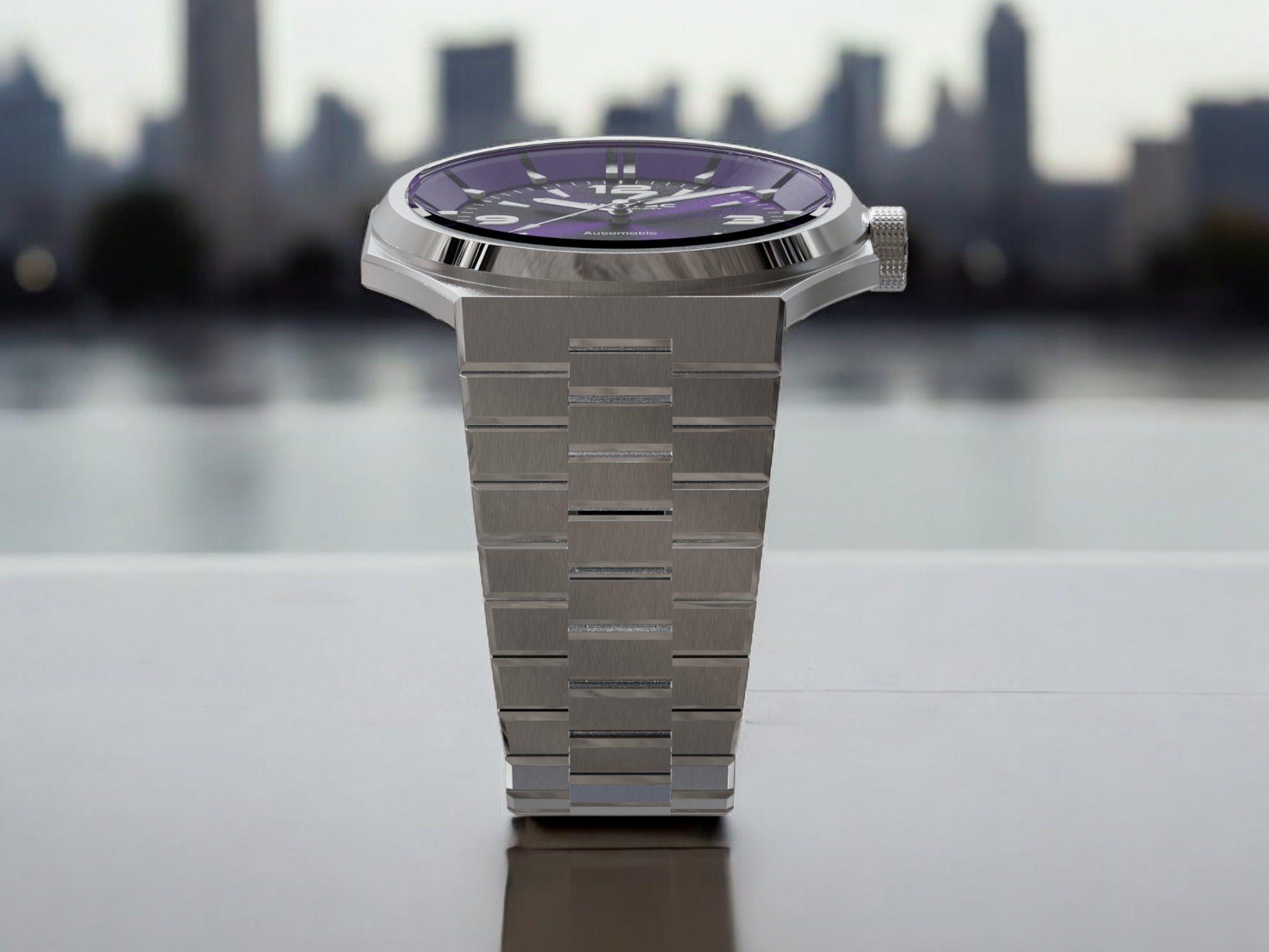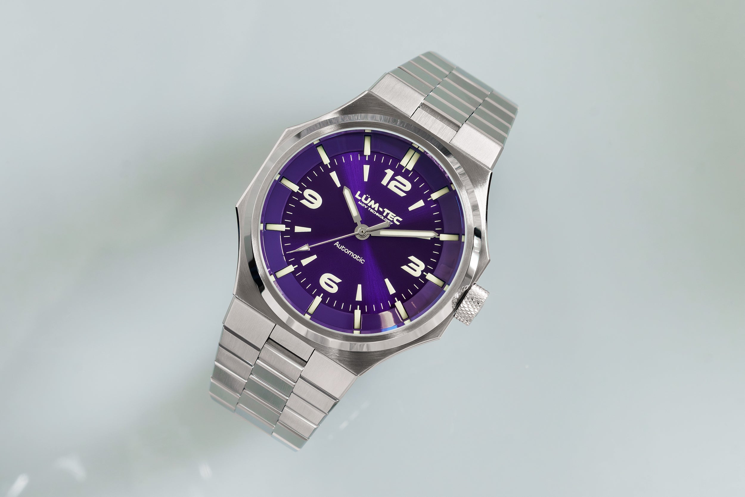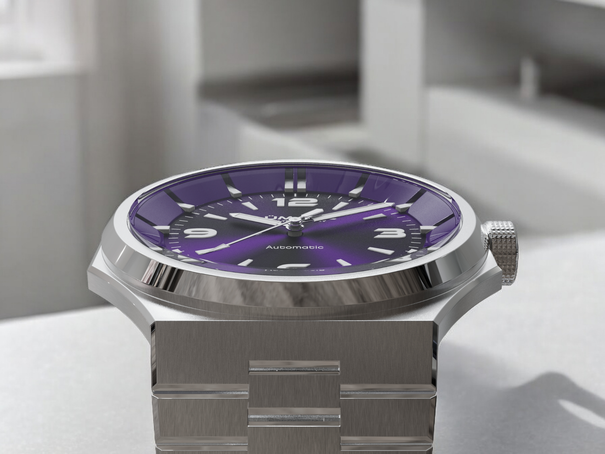 - Bi-layer purple sunburst 3D dial with extruded luminous index