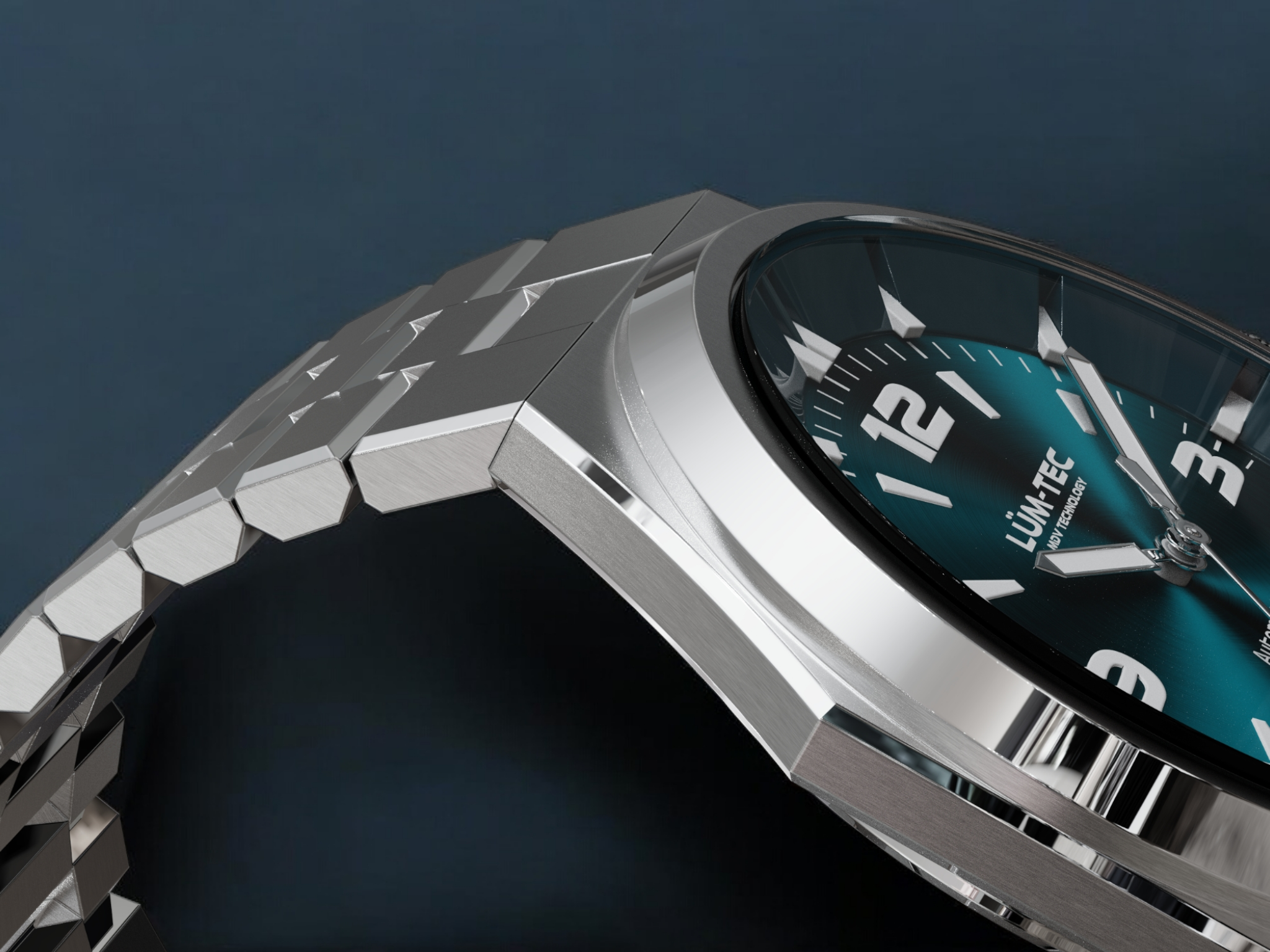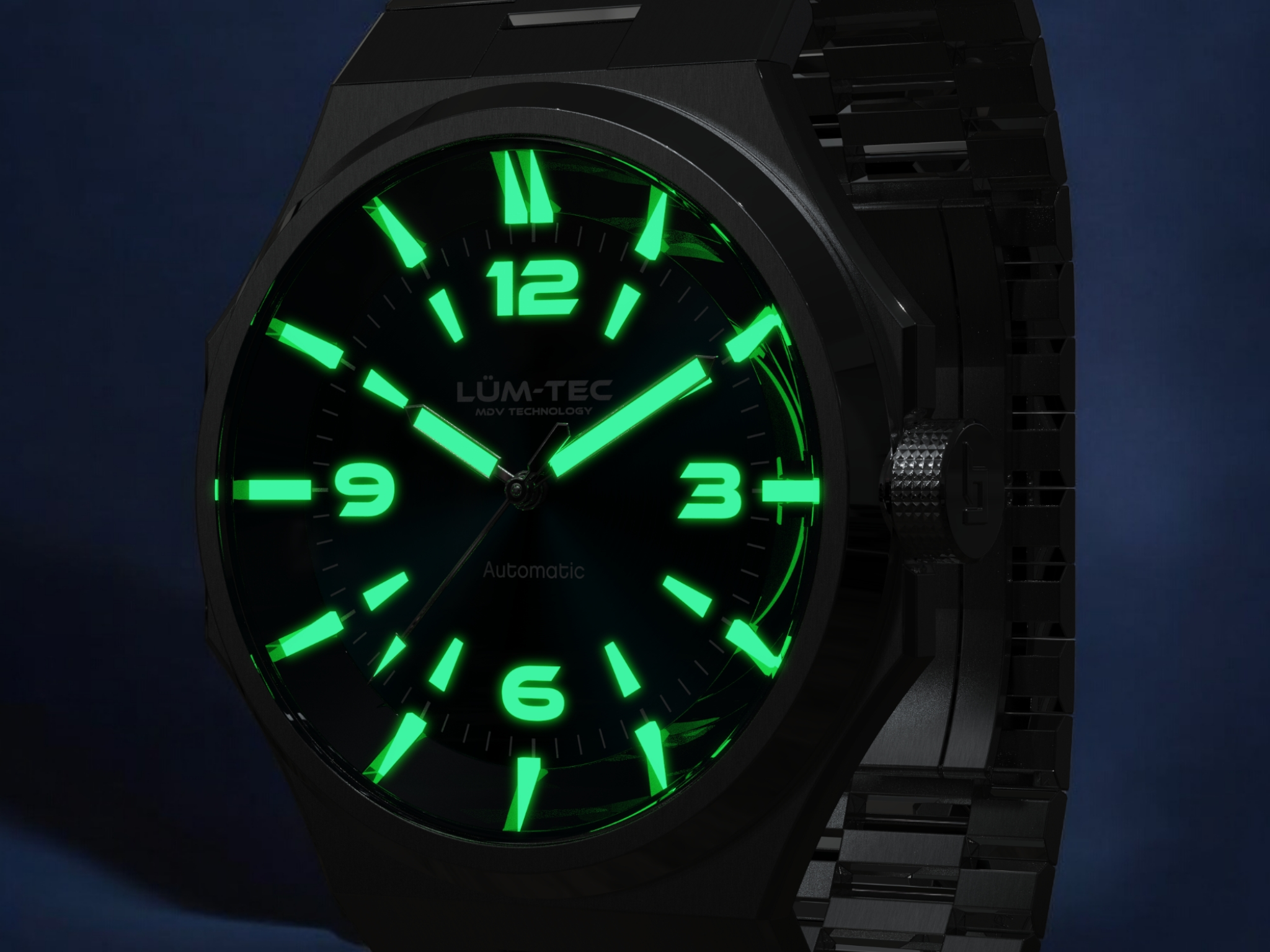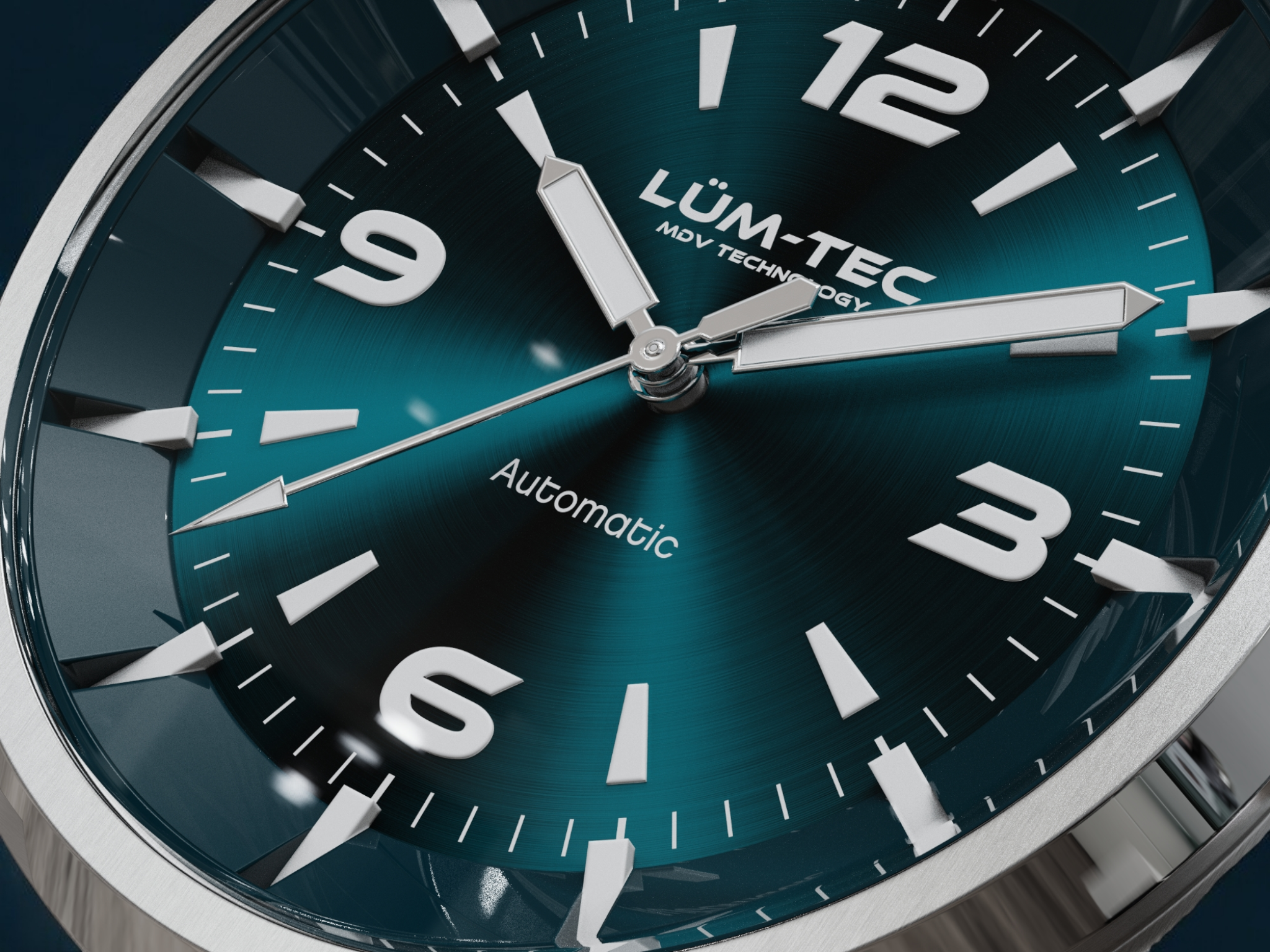 - Bi-layer ocean blue sunburst 3D dial with extruded luminous index