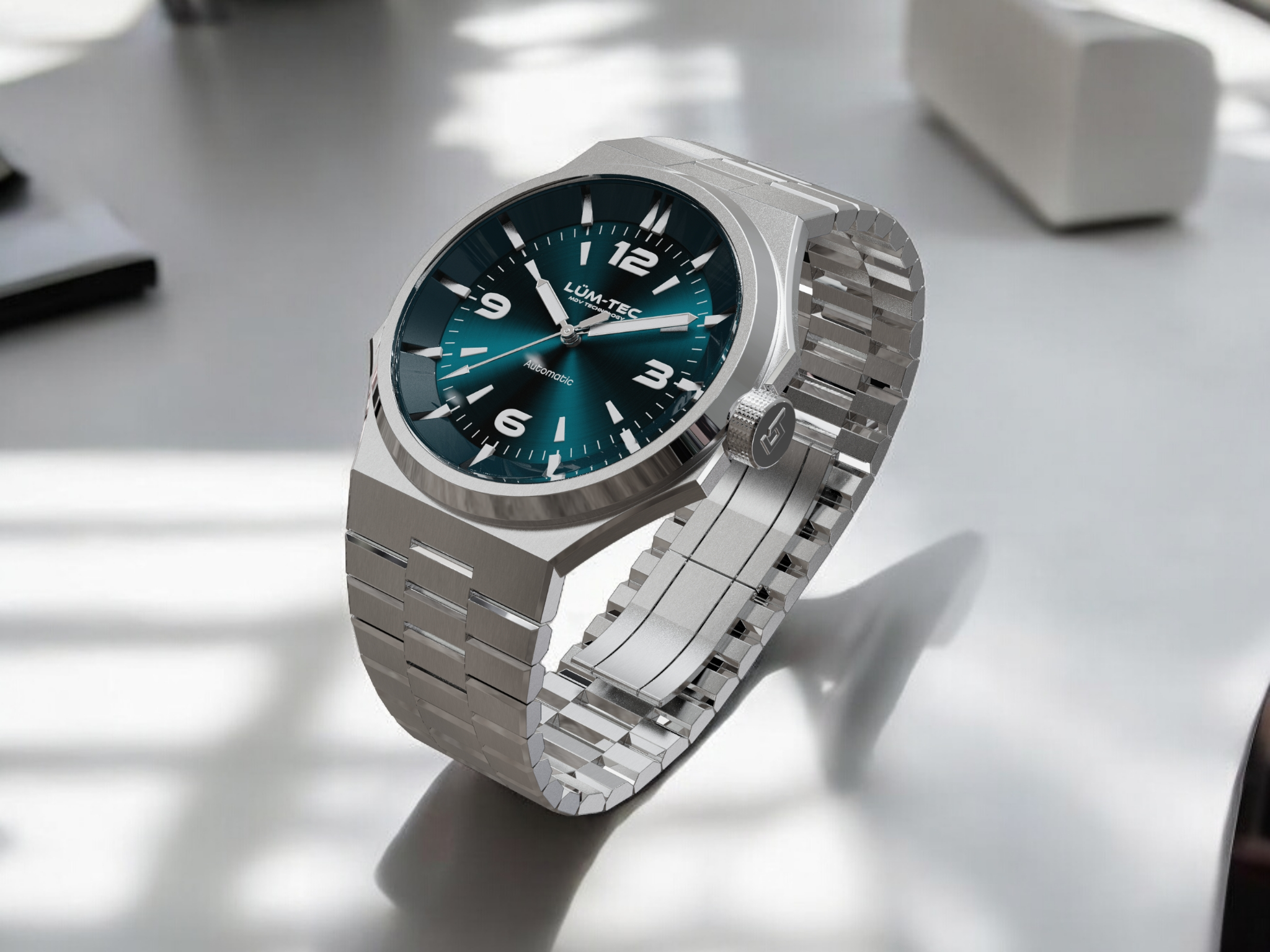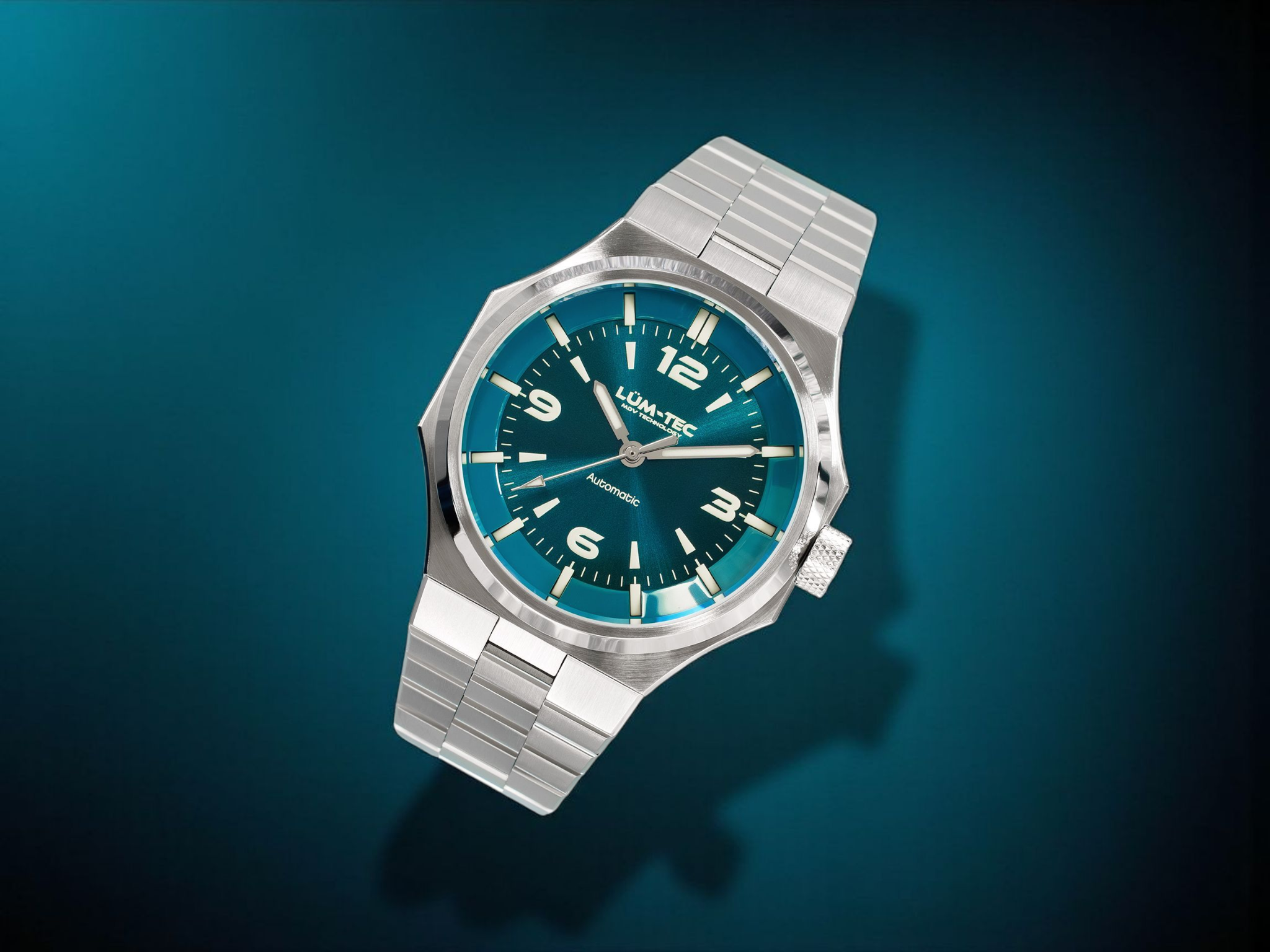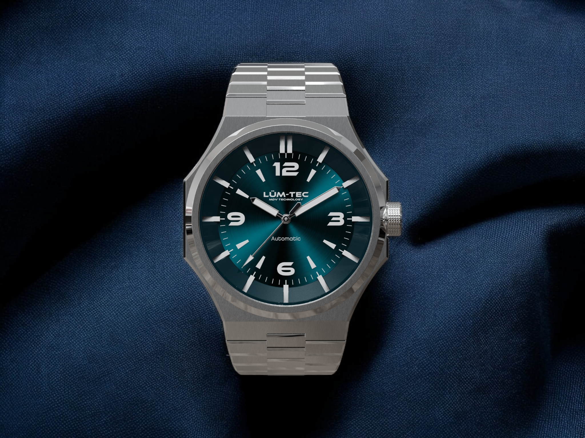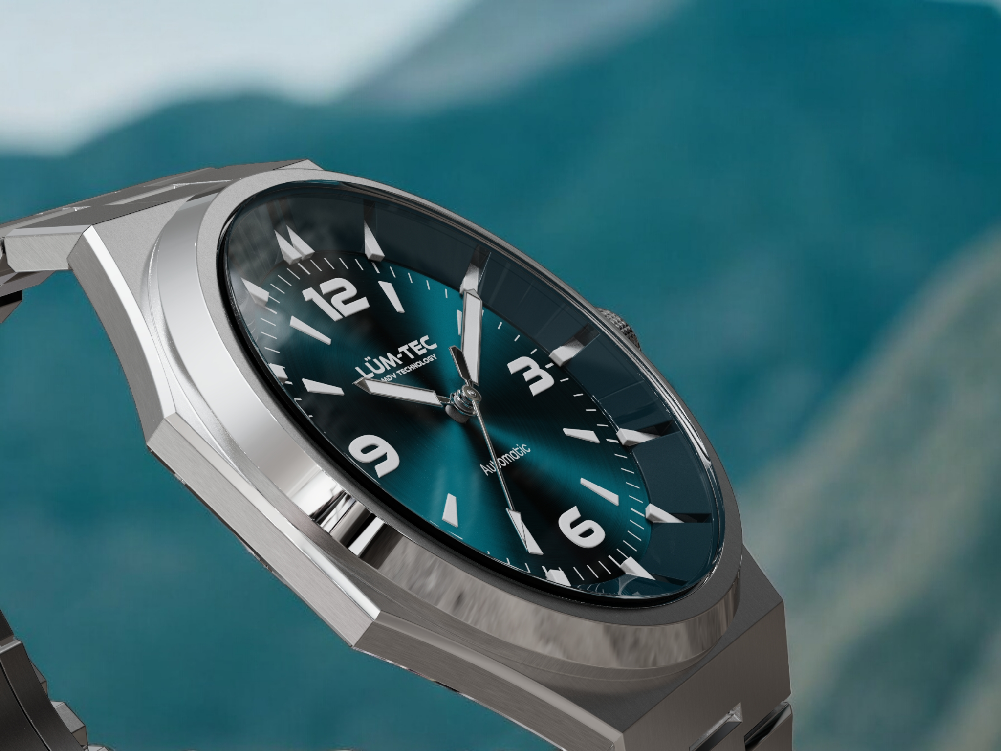 - Bi-layer ocean blue sunburst 3D dial with extruded luminous index